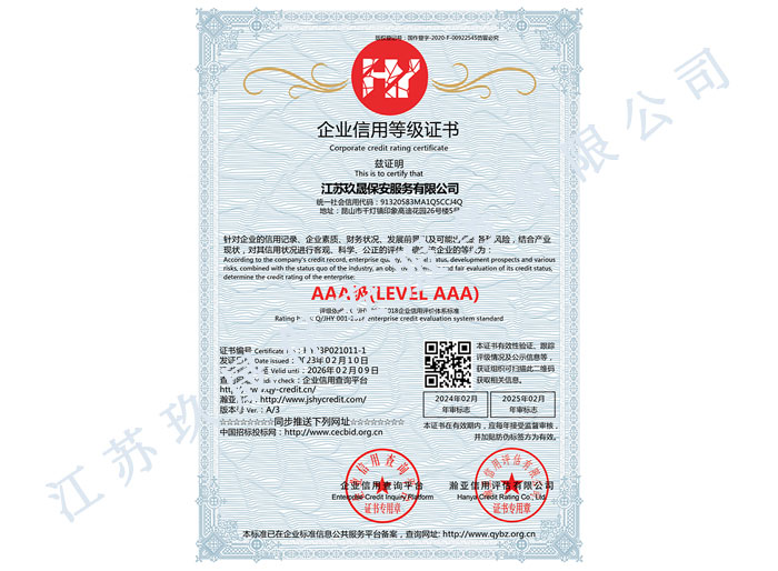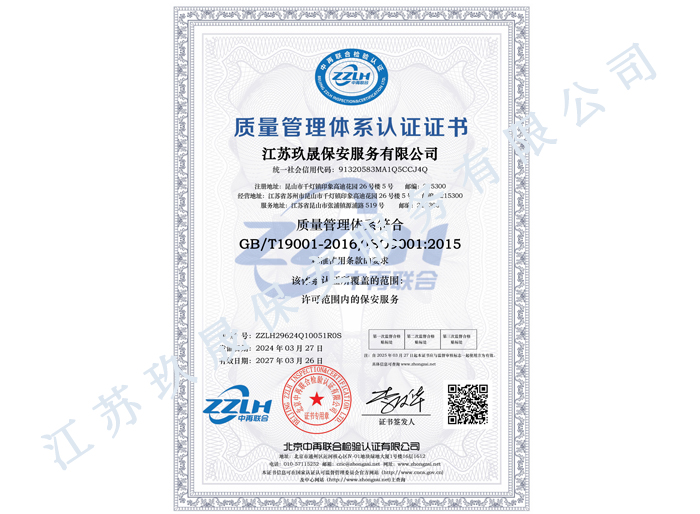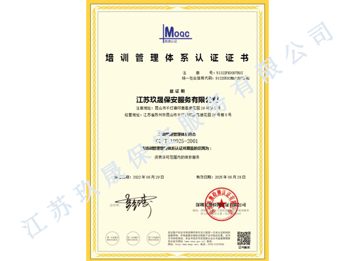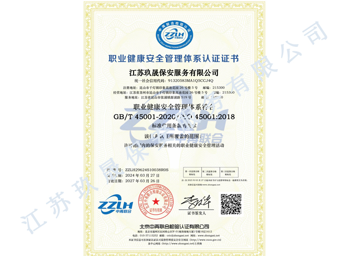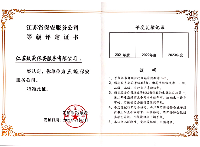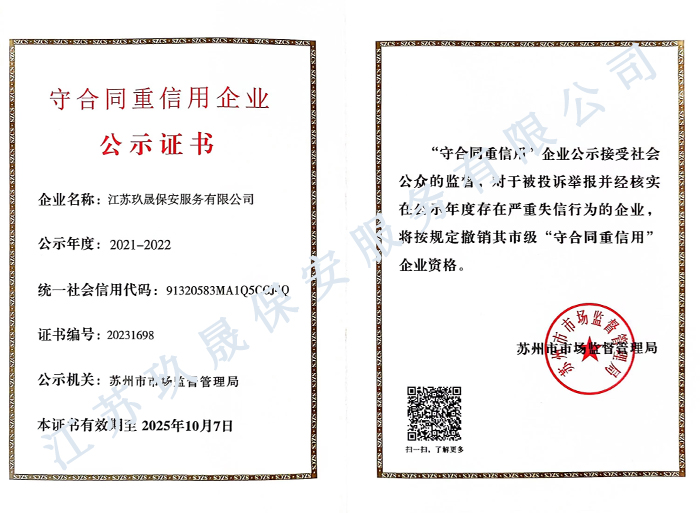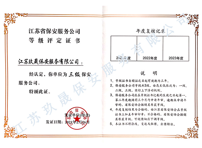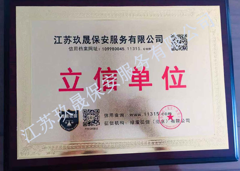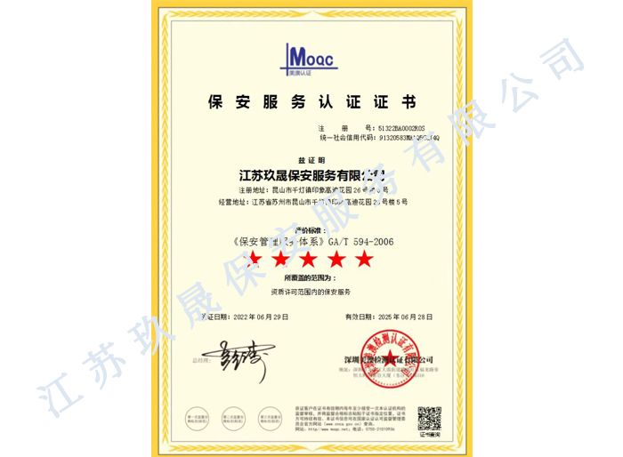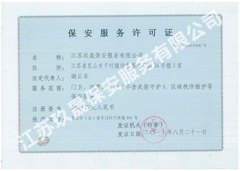 江蘇玖晟保安服務(wù)有限公司成立于江蘇省昆山市千燈鎮(zhèn)。注冊(cè)資金:2000萬(wàn),是擁有省公安廳頒發(fā)的保安服務(wù)許可證的企業(yè)【蘇公保服20170046】,也是昆山市保安協(xié)會(huì)常務(wù)理事單位。